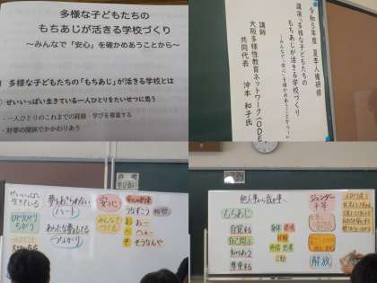 9時から、大阪多様性教育ネットワークから、沖本 和子先生を講師としてお招きし、「多様な子どもたちのもちあじが活きる学校づくり」をテーマに講演やワークショップなどが行われました。