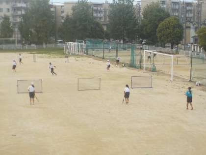 女子は、奥のテニスコートやグランドに防球ネットを置いて、練習しています。