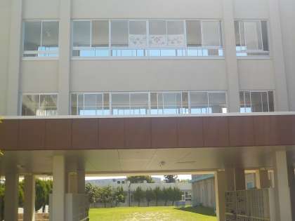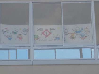 教室棟と管理棟の間の通路にも拡大して、掲示されています。