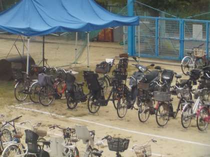 駐輪場には、たくさんの自転車が停まっています。
