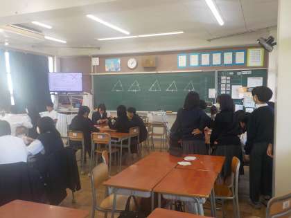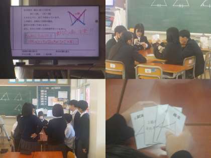 三角形の合同条件について、班ごとにカードを使って学習しています。