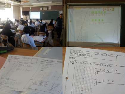 生徒の皆さんの学習プリントを拡大したものがホワイトボードに映しだされ、一つひとつ確認しながら、ゆっくりと授業が進められています。