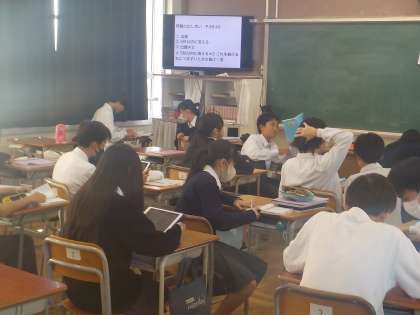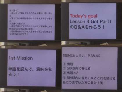 テレビ画面に、振り返り、授業の目標、授業の段取りなどがわかりやすく示されています。(写真下)