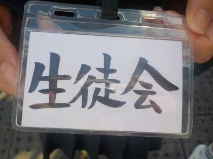 生徒会のプレートをつけて、校門前で元気なあいさつをしています。