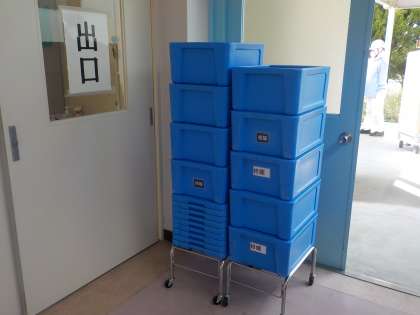 給食の時間が終わり、食器などの回収に来られました。