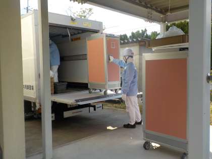 給食の日は、このように給食を運搬していただいています。