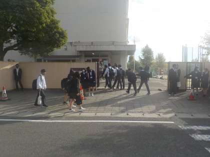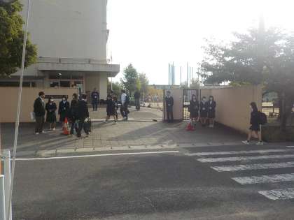 校門を出て、道路の近くで声をかけているので、教員とのあいさつの前に生徒間のあいさつが行われます。
