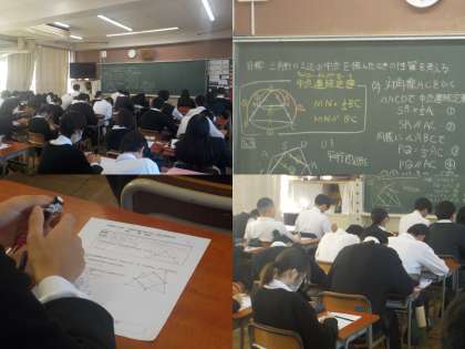 「三角形の2辺の中点を結んだときの性質を考える」が授業の目標です。