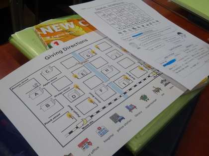 NETの教員が、ある建物までの道順を話し、どこにその建物があるか