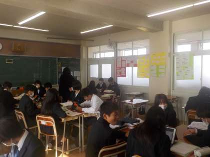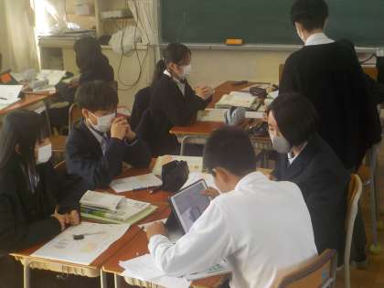 11月20日(月)3校時 2年4組 国語 公開日 2023/11/20 更新日 2023/11/20 学校の様子 「人口ピラミッド」「バリアフリー化の推移」「近所づきあいの程度」などの資料を参考に、これからの共生社会をつくるために必要なことをまとめています。 自分で資料を分析したり、班で話し合ったりする中で、内容が精査されていきます。 これからの社会を生きる生徒の皆さんにとっては、実際に対応する必要のある問題です。 活発な意見交流の様子が見られました。 いいね(0)