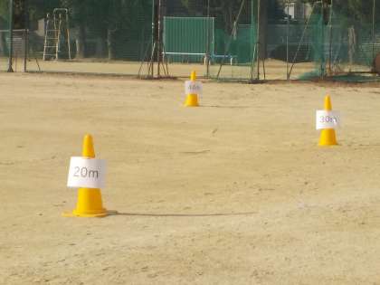 また、黄色のカラーコーンには、距離の表示が貼られています。自分で途中経過を知ることができます。