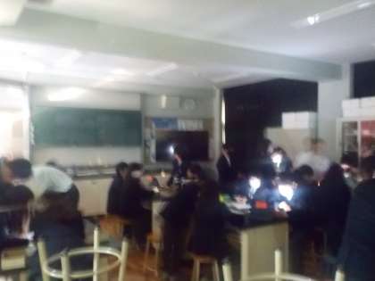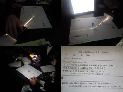 上の写真では、教室内が明るくうつっていますが、実際は暗い中で実験が行われています。