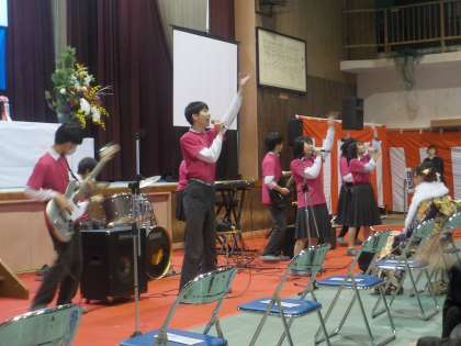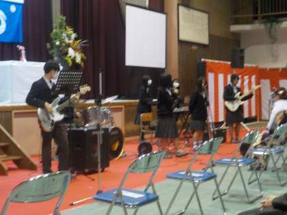 はたちのつどいのオープニングに軽音楽部の皆さんが新成人に向けて、お祝いのメッセージと演奏のプレゼントをしました。