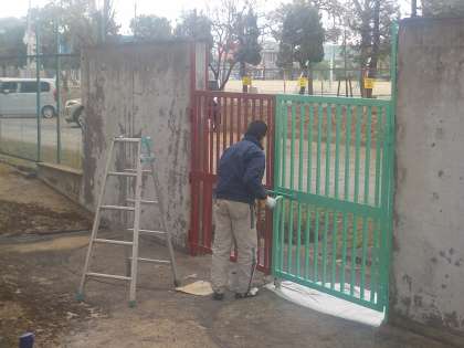 校務員さんが裏門にペンキを塗っています。