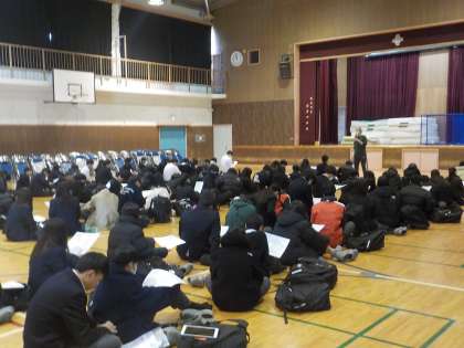 3校時までの卒業テストが終わり、4校時に体育館で、私立高校等の出願者集会が行われました。