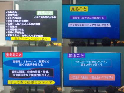 生涯を通してスポーツに取り組むことや、スポーツ活動を支える人など、スポーツについて、広い視点から考えています。