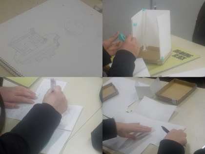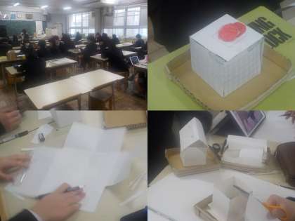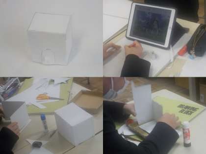 画像を参考にしたり、図形の平面図を描いたり、一人ひとりが自分のイメージをふくらませて、作品づくりをしていました。
