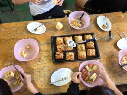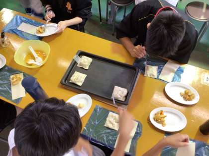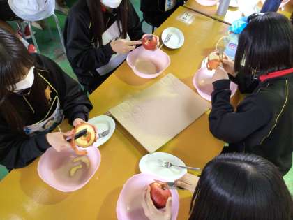 14時45分に三和観光農園に到着し、アップルパイ作りとリンゴの皮むき大会に取り組みました。各クラスの上位3位には豪華景品がいただけるということで、子どもたちは一生懸命に取り組んでいました。最高記録は150cmでした。