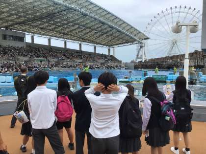 宿舎を後にし、10時20分に名古屋港水族館に到着しました。水族館ではイルカのパフォーマンスやシャチの公開トレーニングを見学したりして楽しんでいます。