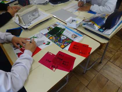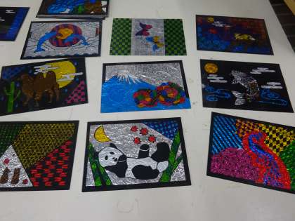 自分でデザインしたものを切り取り、セロファンを貼っていきます。
