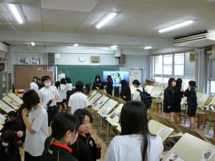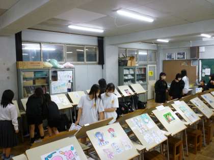 放課後、美術室において美術部による展示会が開催されました。廊下には展示を心待ちにする子どもたちがたくさんおり、開室されると同時に「すごい!」といった声が聞こえてきました。ポスターカラーの鮮やかな色使いや色紙に描かれた表情がとても素敵でした。