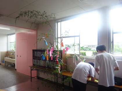 各学年には笹と短冊が置かれ、自由に書き込んでいます。