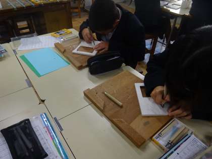 2年生の美術では写真立てへの彫刻が進んでいます。