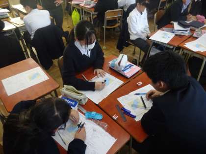 今回は、その応用で「海上にある船の位置を示された様々な角度から導き出す」といった問題をグループで考えて解いています。グループ内で色々な意見が出ながら一つの答えを出していました。