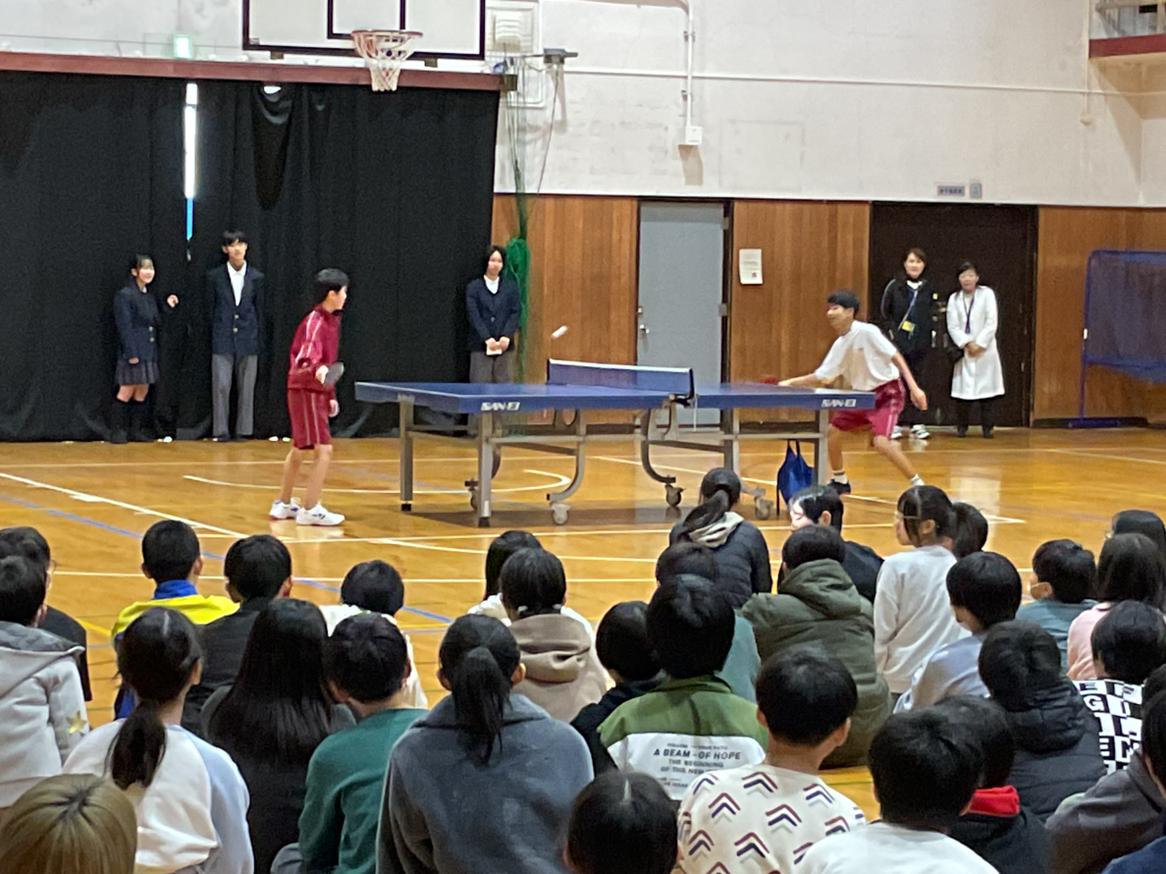 こんにちは。卓球部です。私たちは、2年生4人、1年生6人で日々楽しく活動しています。練習日は、週4日で体育館や卓球室で活動しています。卓球は、個人戦だけだと思いがちですが、チームで戦う団体戦は個人戦にはない面白みがあります。みなさんと一緒にがんばって勝ちましょう!