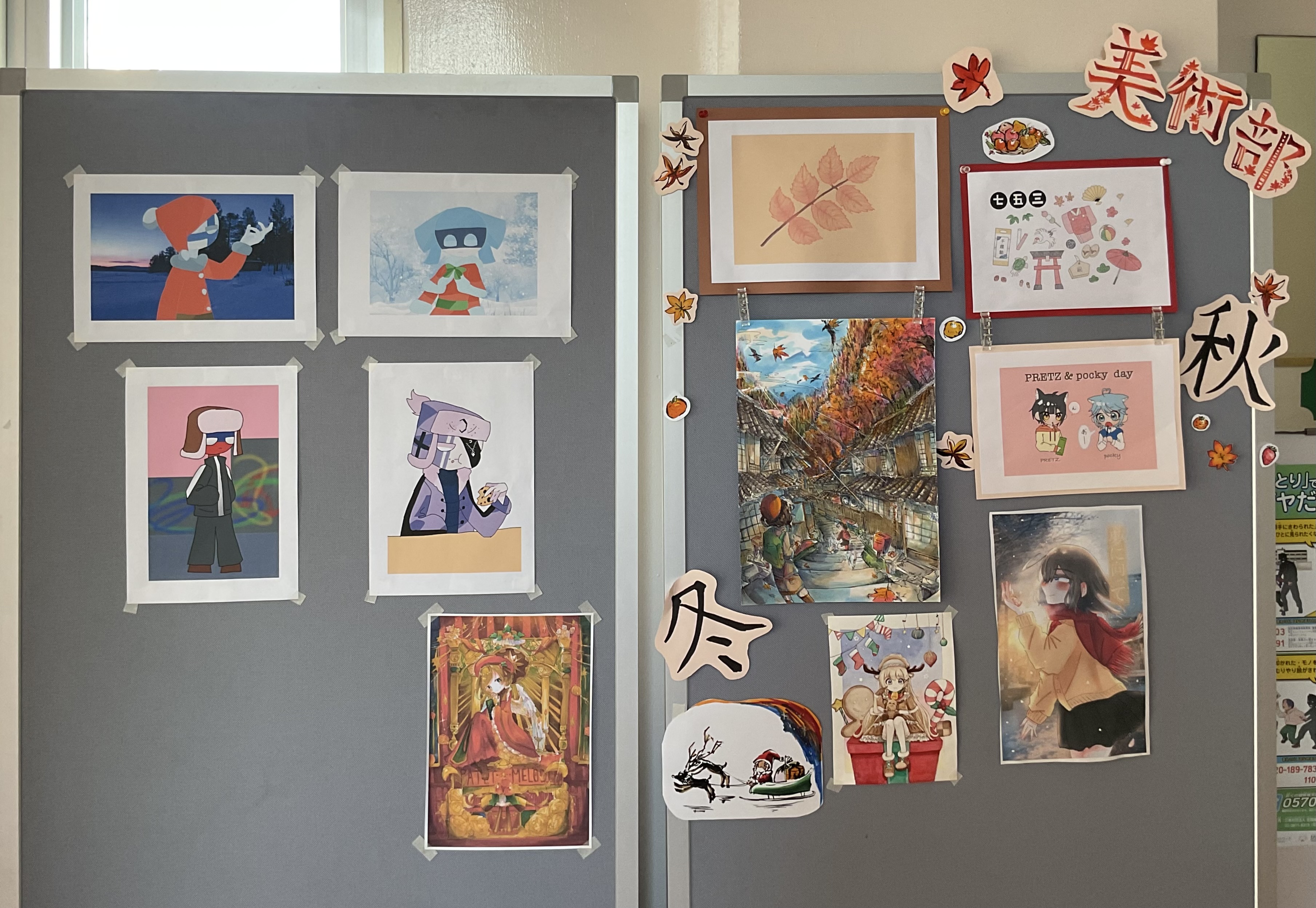 《4月新入生オリエンテーション》 こんにちは皆さん! 美術部は絵を描いているというイメージが強いですが、楠葉中学校の美術部は月一回の展示や陶芸やアクリルスタンドづくりなど幅広いです。活動時間は、基本的に放課後の月曜日から木曜日の週4日です。 活動実績としては、この春に地元の商店に依頼されて鉄板焼き店の「のれん」や整骨院に飾る作品をつくりました。お店の人も喜んでくれました。見た人がつながり合えるようなデザインが完成しました。 さらに、楠葉中学校50周年記念事業のイベントのポスターも作成しました。文化祭では、作品をつくって展示し、見ている人が楽しんでくれました。男女や絵の得意、不得意関係なく活動し、とってもやりがいのある部活です。ぜひ入部してくれるとうれしいです。