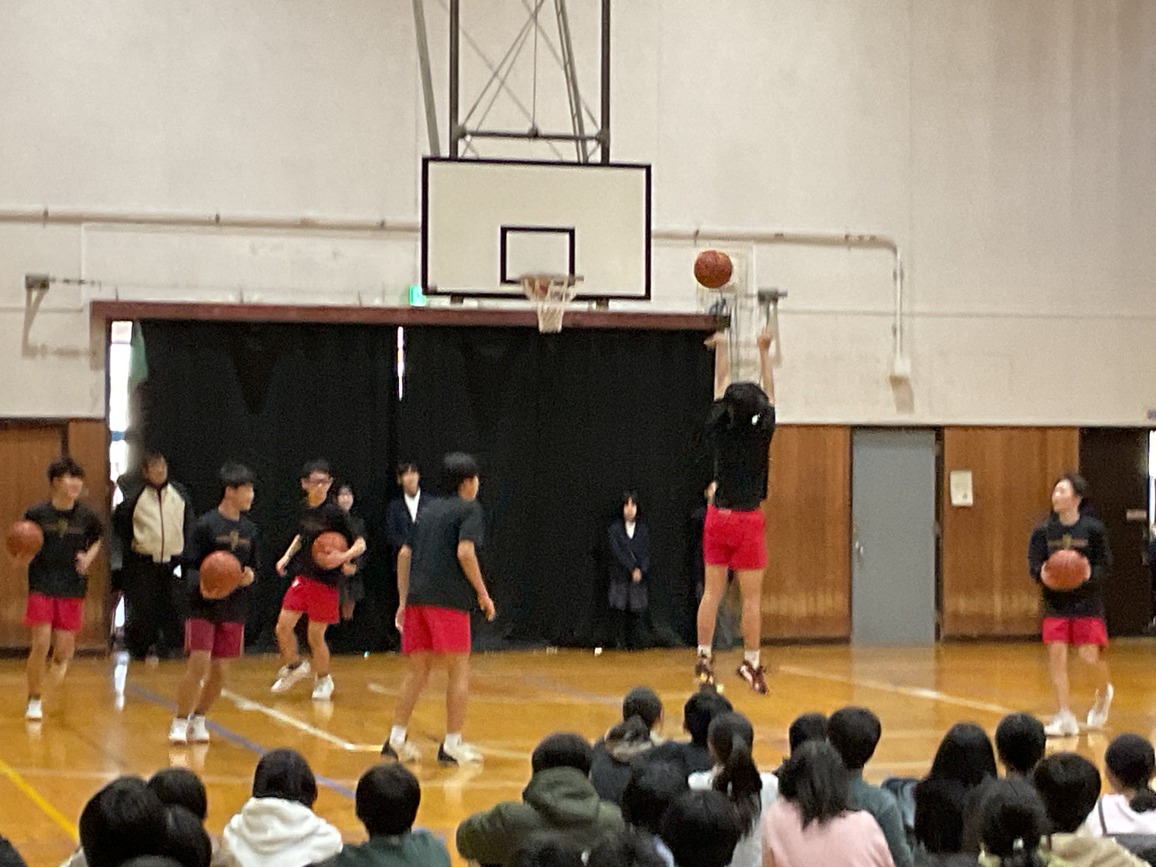 みなさん、こんにちは! 男子バスケットボール部です。現在、2年生8人、1年生4人で元気に活動しています! チーム目標は、枚方市1位と北河内ベスト4で、秋の枚方新人戦で準優勝(12月の北河内大会の結果)しました。今からパフォーマンスを行うので、楽しく見てください!