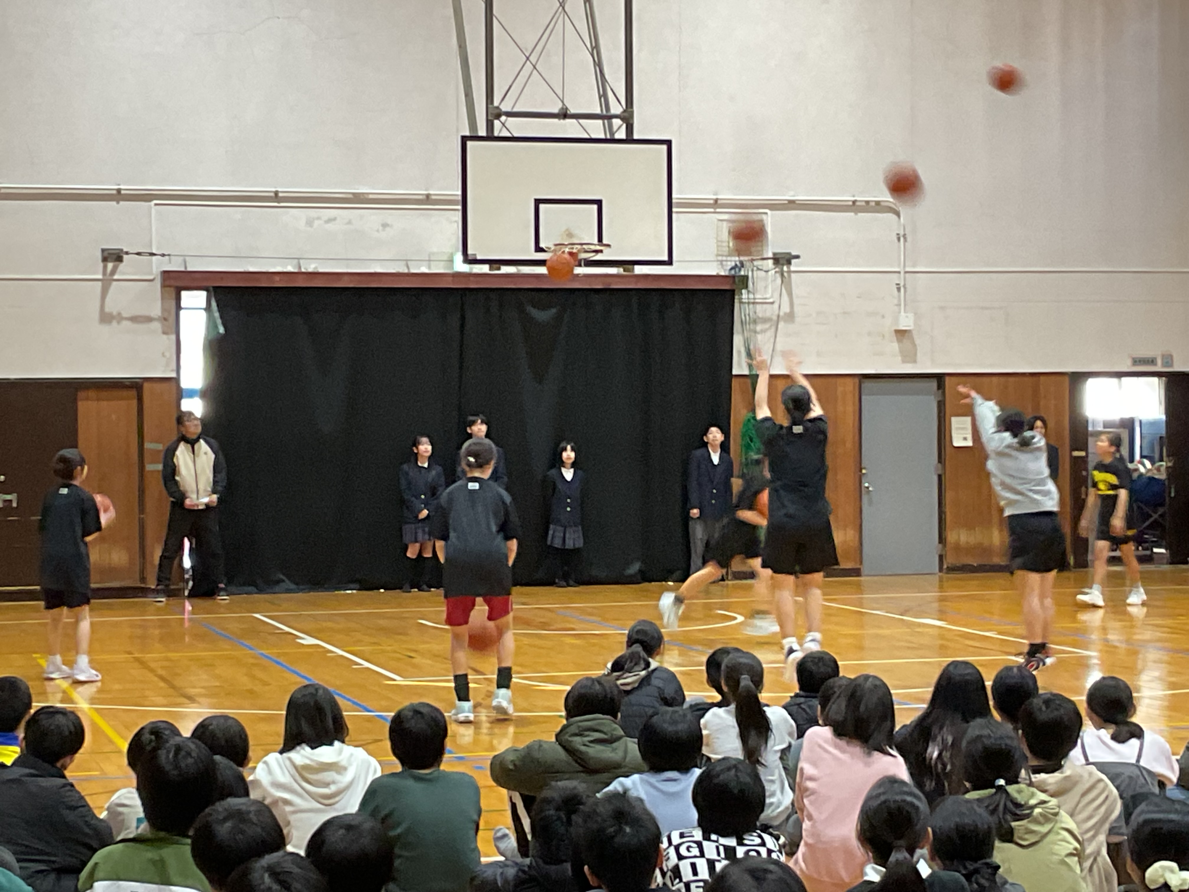 こんにちは、女子バスケットボール部です! 私たちは、元気・仲良し・最後まであきらめないことを大事にして活動しています。練習は、きついときもあるけど、チームワークを大切にして楽しい時間の方が多いです! 試合でシュートが入った時の気持ちよさは最高です! できなかったことができるようになって試合で活躍できた瞬間は本当に最高です! ぜひ女バスへの入部を考えてみてください!