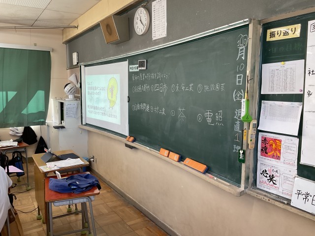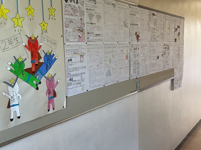 写真は、10月10日の2年生の社会の授業風景です。今日の授業は「東海地方の産業の特徴を調べよう」です。グループでテーマに沿って調べ学習に取り組んでいます。廊下に掲示されているレポートは、都道府県を決めて、調べた内容をまとめたものです。