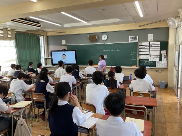 1枚目は、3年生の英語・・・「関係代名詞の使い方を理解できる!!」。プロジェクタに替えて各教室に置いた大型ディスプレイモニター(65型)を活用して授業を行なっています。このディスプレイモニターは、今年は3年生の教室に設置しましたが、学校予算をやりくりして何とか来年度には全学年全クラスに設置したいと思っています。