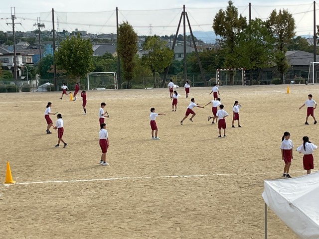 2枚目は、2年生の保健体育の授業で、リレーのバトンパスの練習をしているところです。