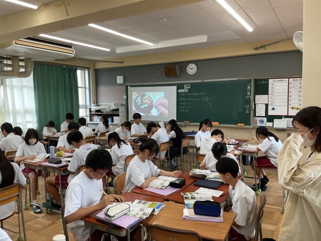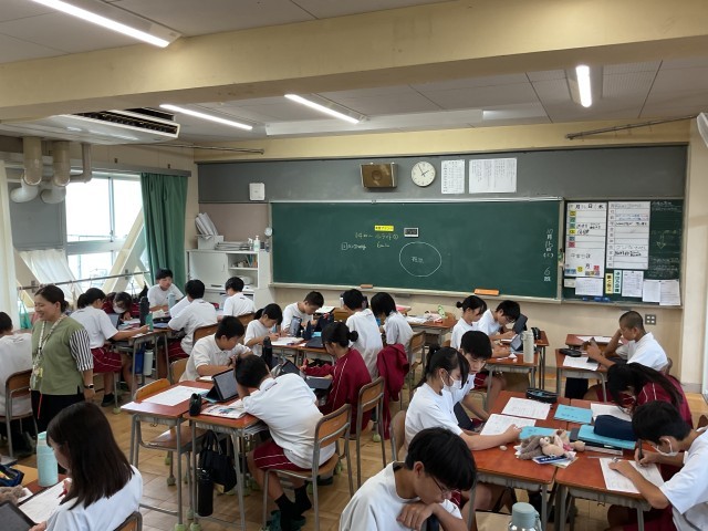 5時間目・・・2年生の社会科では、北陸で盛んな産業について班で学習していました。また、数学は図形の性質について、プリントの問題を班で一緒に考えながら解いていました。