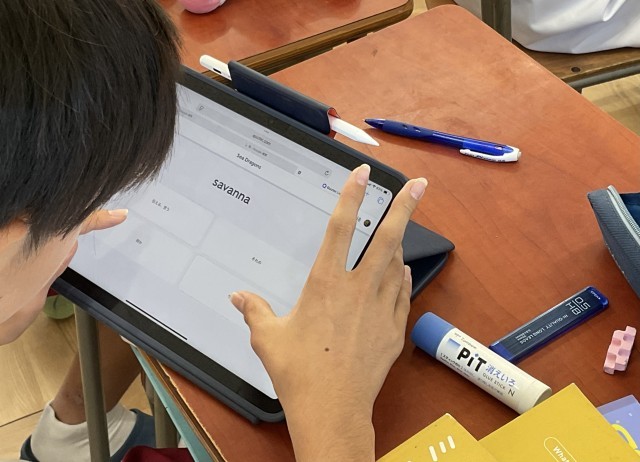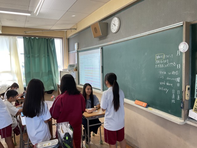 1年生の英語の授業では、「Whoseを使って誰のものかを尋ねることができる」をねらいとして、(参観した時は)暗唱やタブレットを使って学習していました。