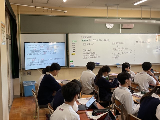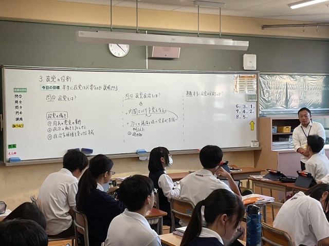 2年生の理科の授業では、「物質重要語句BINGO」で盛り上がっていました。3年生は、政党の役割について、その必要性を説明できることを目標に、いろいろな視点から話し合っていました。