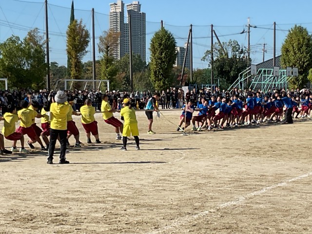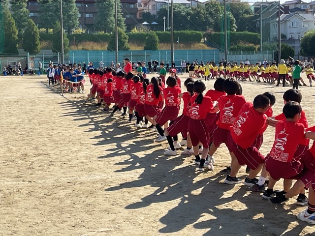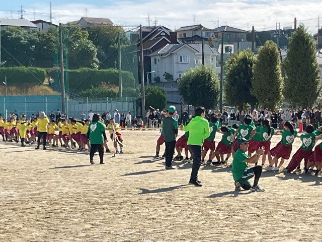 続いて新種目の「綱引き」。各団の総当たりで行い、真ん中の旗を制限時間(1分間)内で倒すか、制限時間で旗が傾いている団が勝ちとなります。掛け声に合わせて力一杯引き合っていました・・・どの団も先生の掛け声が響き渡っています。