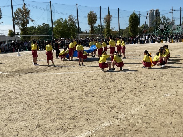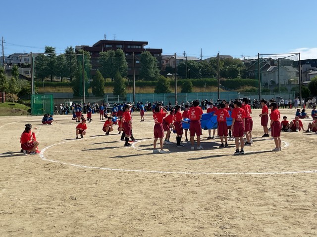 今年度の学年種目はすべて新種目です。1年生の学年種目「ぶ・る・ば・ぼ」は、1チーム9人が「ブ」「ル」ーシートを持ち上げ、シートの上に置いてある「バ」ケツの中にバレー「ボ」ールを入れて地面に垂直に立たせてリレーする競技です。最初、背中合わせに置いてあるバケツとバレーボールを9人が息を合わせて上手く入れることに苦労しながら、懸命に取り組んでいました。
