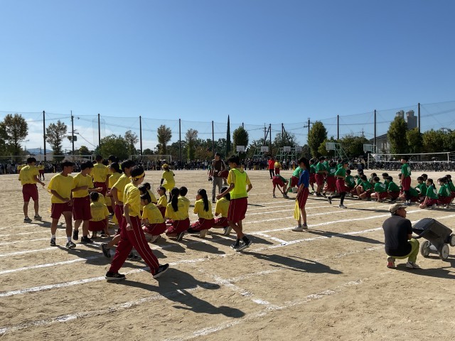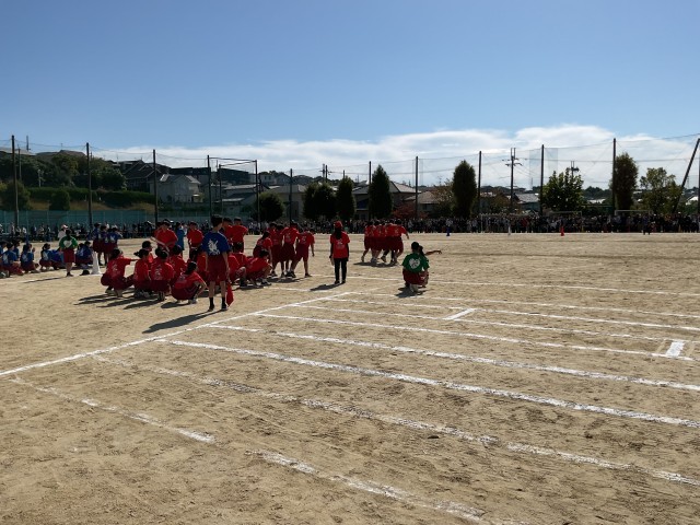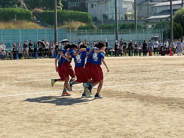 2年生の学年種目「多人多脚リレー」は、2人3脚から最大6人7脚まで人数が増減しながらリレーを行います。練習の成果を発揮し、力走が続きます。
