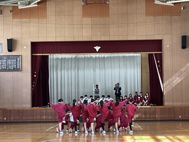 3年生もグループで相談したり協力して授業に取り組んでいます。写真は、上から順に、数学「立体の相似」、保健体育「ダンスの発表」、理科「道具を使った仕事」の授業の様子です。