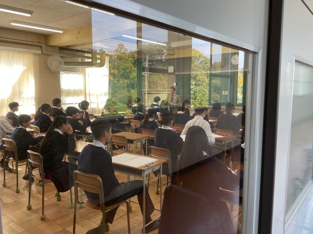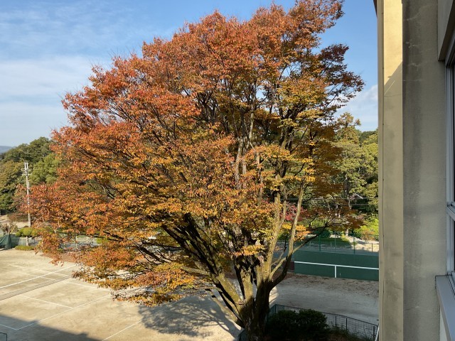 穏やかな秋の日。グラウンドや中庭の木も紅葉が進んでいます。期末テストも3日目、写真は最後の教科のテスト開始を待つ生徒達の様子です。