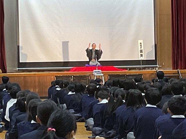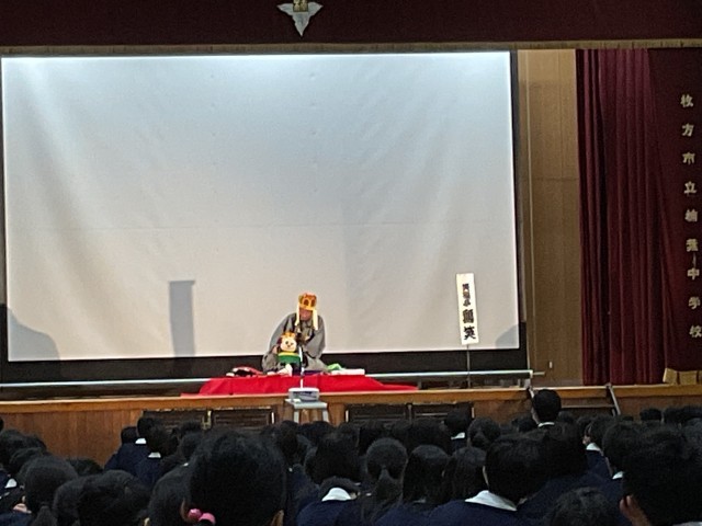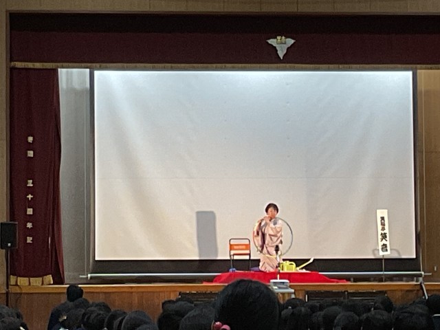 11月28日(金)、NPO法人「国境なき芸能団」の代表として世界各地で活躍されている笑福亭鶴笑さんとそのお弟子さんである笑福亭笑音さんにお越しいただき、落語解説・パペット落語・古典落語・紙切りや日用品でつくられた楽器演奏等を披露していただきました。生徒達は、真剣な表情でその芸を観て、心の底から笑っていました。