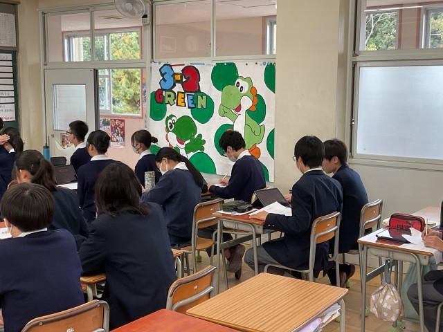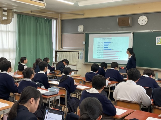 睡眠・記憶・心理・タイムマシン・自動運転・音楽・地震など日常の疑問や興味関心がある事柄について一人一人が探究し、1・2年生、そして保護者の方の前で発表する取組。テーマの設定、情報収集、スライド作成、プレゼンの工夫等、14時間をかけて準備をして迎えた本番。3年生が15の教室に分かれてプレゼンテーションを行ってくれました。緊張しながらも堂々とプレゼンし、1・2年生からの質問にもしっかり答えていた3年生の姿はとても頼もしく感じました。3年生には、この取組を通して感じた「探究」することの楽しさや奥深さをこれからの生活に活かしてほしいと願っています。発表する3年生の姿を見て学んだ1・2年生は、自分の発表の機会にぜひ活かしてほしいと思います。