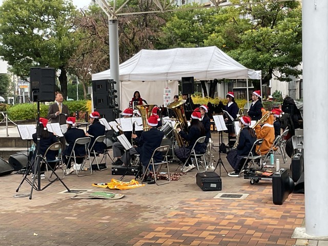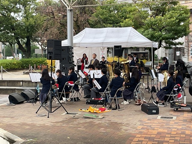 12月21日(日)に、ニッペパーク岡東中央(岡東中央公園)で開催された「志フェス」に本校の吹奏楽部が参加しました。冷たい雨が降る中、予定より30分遅く10時30分に開演し、最初に演奏を披露しました。クリスマスソングメドレー、 Snow Manの楽曲、昭和歌謡、そして「銀河鉄道999」を会場の皆さんに聴いていただき、温かい拍手をいただきました。