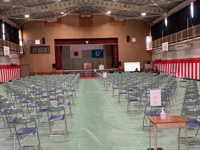今朝から体育館では「はたちのつどい」の準備をされています。ご覧のとおり、準備は午前中にほぼ終わり、今、最終チェックの段階です。朝から冷たく強い風が吹く今日に続き、明日も厳しい寒さの予報になっていますが、「はたち」を迎えられた方、ご家族や地域の方々がこの会場にお越しいただき、思い出に残る一日となることを願っています。