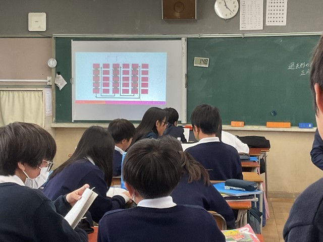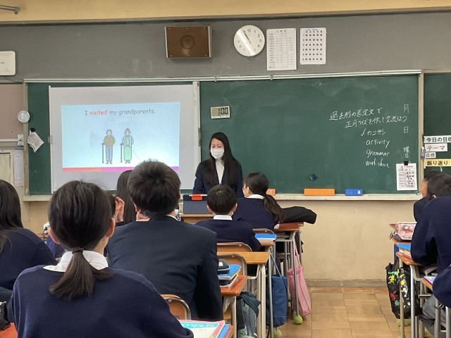 3時限目、英語科の研究授業を行い、9名の教職員が参観しました。1年生の「A trip to Finland」の単元で、生徒達は過去形の否定文について学習していました。お正月を題材として過去形否定文を3つ考え、ペアになってクイズ形式で交流していました。