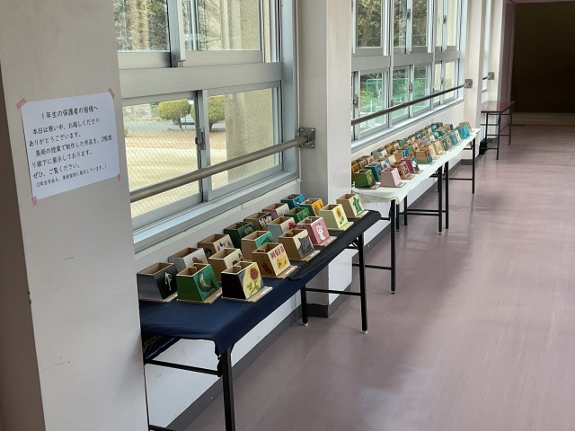写真は、3時限目の2年生の美術の授業風景です。文字のデザインについて勉強していました。美術室の廊下と2階の渡り廊下には生徒達の作品を展示しています。