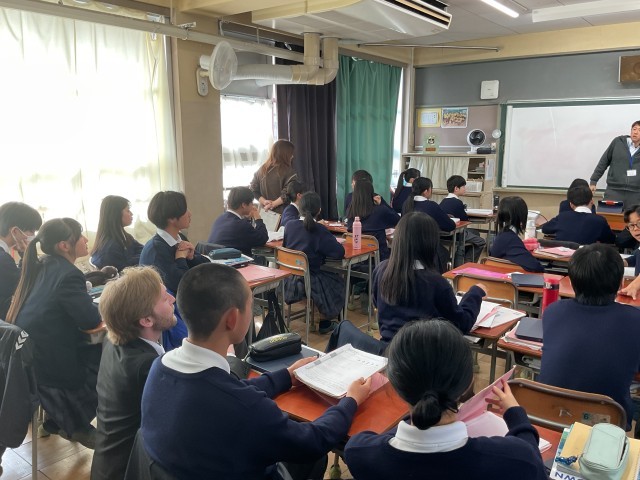 写真は、公開した授業の一つ、英語の授業風景です。生徒達は「落語の演目や演じ方についてお互いに説明できる」ことを目標に、テンポよく授業が進む中、集中して課題を聞き、意欲的にペア活動などに取り組んでいました。
